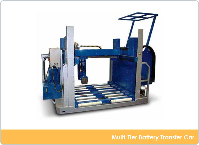 This transfer car stores batteries in a single level storage system. The car moves along an aisle beside the storage modules where it will pick and place batteries. A joystick with proportional sensitivity controls all movements in a smooth and efficient manner.